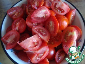 Томаты промыть, разрезать на 2, крупные на 4 части.