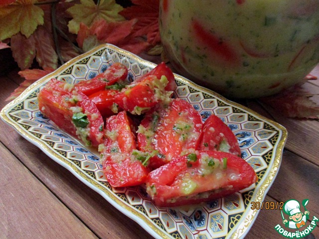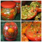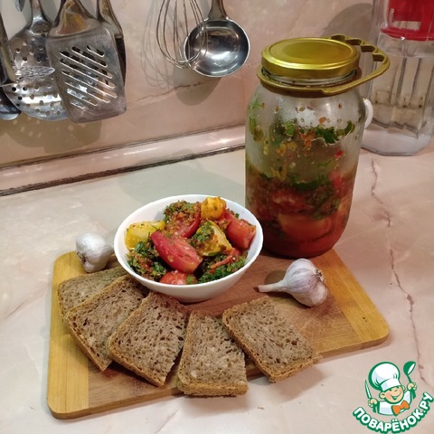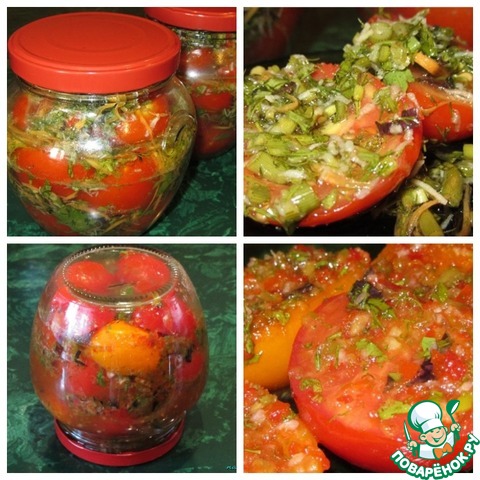 В 3х литровую банку (а этот объём насчитать как раз на неё) укладывать слоями помидорчики и нашу заправку, чередуя их.