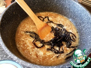 Добавить разболтанные яйца, активно размешать. Выложить нарезанный соломкой нори, добавить кунжутное масло и пряности по вкусу. Я пользуюсь китайской смесью «пять специй». Размешать суп и выключить.