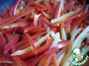 Болгарский перец (у меня разноцветный) и перец чили нарезать соломкой.