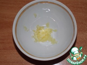 Чеснок пропустить через чесночницу. Если любите блюдо поострее - можно добавить 2 зубчика чеснока.