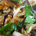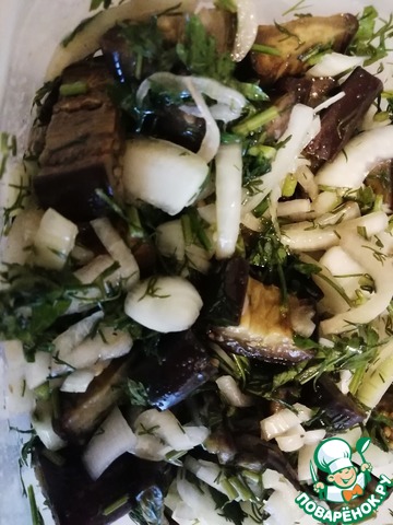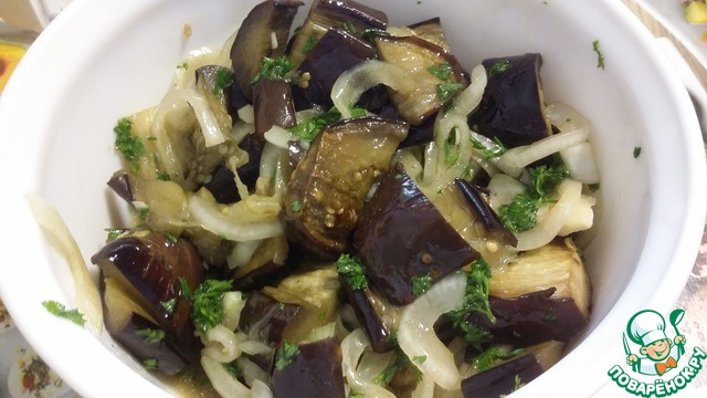 Нарезаем пласты баклажанов кусочками и складываем в маринад. Перемешиваем.