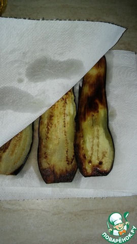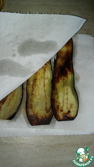 Обжарить баклажаны на сковороде с добавлением растительного масла. Каждый кусочек после обжарки выложить на бумажное полотенце, сверху тоже положить бумажное полотенце. Это позволит убрать излишки масла.