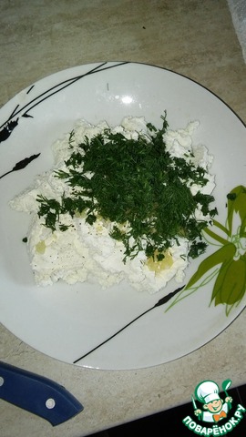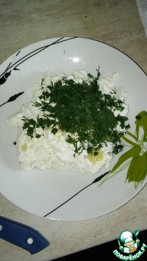 Приготовить начинку. Смешать творог, сметану, зелень, чеснок, немного посолить. Помидор тонко порезать.