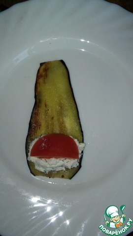 На кусочек баклажана выложить примерно полторы чайной ложки творога и помидор
