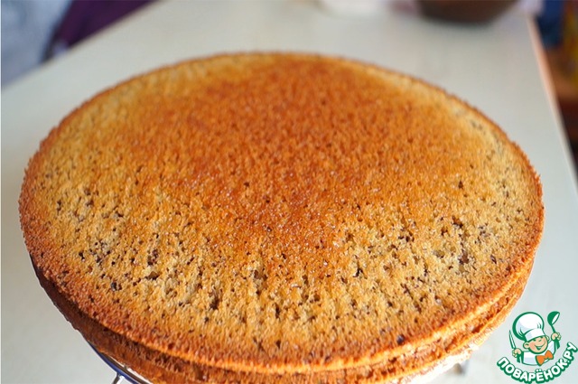 В небольшой кастрюльке смешать сахар, масло сливочное, какао-порошок и молоко, ставим на медленный огонь, помешивая, доводим до однородного состояния. Каждый бисквит разрезать на два коржа. Собираем торт: