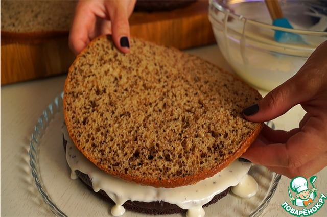 Выкладываем поочередно шоколадные и ореховые коржи, промазывая сметанным кремом. -