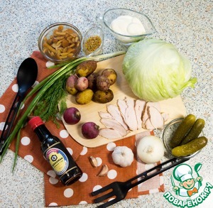 Ингредиенты для «Салат с курицей, овощами и соленьями»: