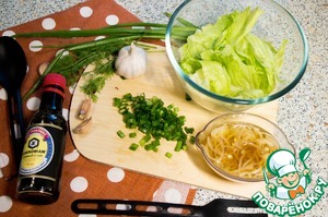 Нарвать листья салата и нарезать зеленый лук. Замариновать белый лук: добавить соль, сахар, уксус и соевый соус ТМ Kikkoman. Дать немого постоять, затем залить кипятком. Оставить настаиваться.
