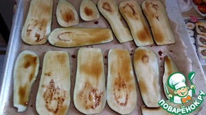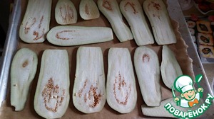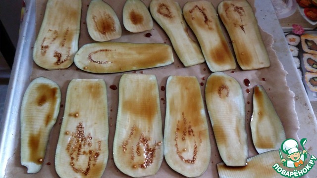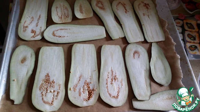Берем противень и застелаем пекарской бумагой. Сверху выкладываем в один слой наши слайсы из баклажан.