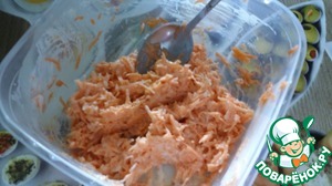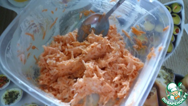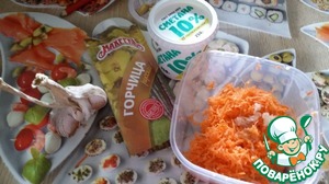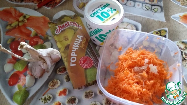 2) морковная (берем срочную морковь. трем на терке самой мелкой, добавляем чеснок пропущенный через пресс, либо потереть на терке, сыр также трем на мелкой терке, заправить соусом: сметана+горчица+соевый соус) -