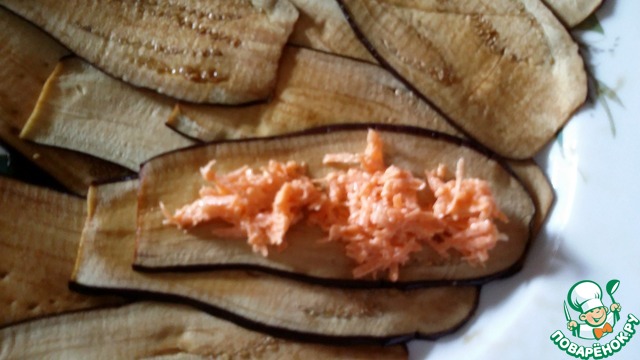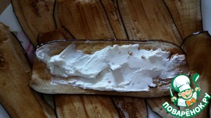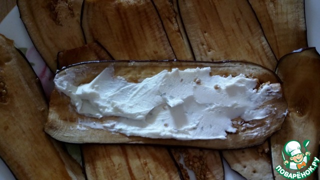 Теперь берем нашу начинку и смазываем слайсы из баклажан (творожная начинка). скручиваем все в рулетики