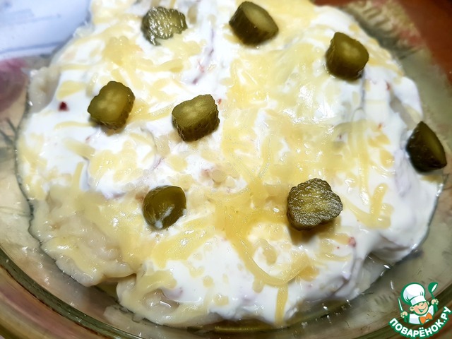 Присыпать сверху тёртым сыром и отправить в разогретую до 190-200 градусов духовку где-то на 20 минут.