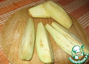 Разрезать каждый баклажан вдоль на 4 части.