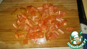 Пока филе обжаривается, с помидор снять кожицу. Я делаю следующим образом: кипячу воду в чайнике, на помидорах (снизу) делаю крестообразный надрез; кладу их в раковину и поливаю закипевшей водой из чайника. После даю остыть и снимаю кожицу.