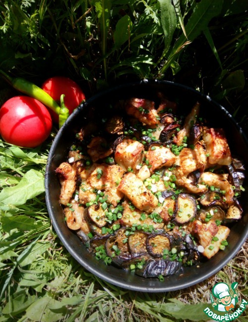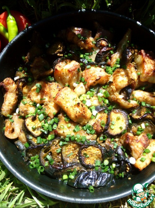 Через 30 минут промываем баклажаны холодной водой, рыбу режем кусочками. Всыпаем все приправы и соль.