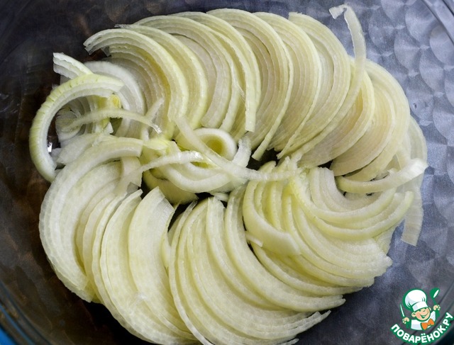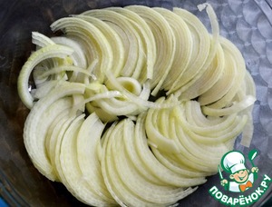 Лук режем соломкой, выкладываем на дно жаропрочной кастрюли.