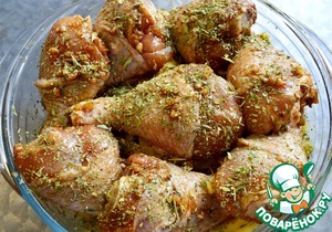 Куриные голени маринуем в соевом соусе Kikkoman Teriyaki с сушёным зелёным базиликом.