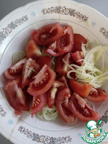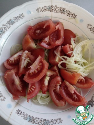 • Кабачок очищаем от кожуры, трем на терке. Помидоры моем, режем дольками.