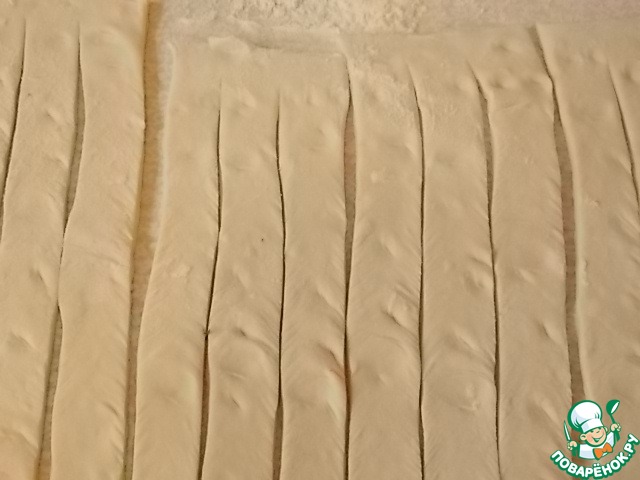 Тесто раскатать в прямоугольник. Разрезать на 6 одинаковых полос и каждую, не дорезая до конца с одной стороны, разрезать на 3 полоски. Посолить сверху.