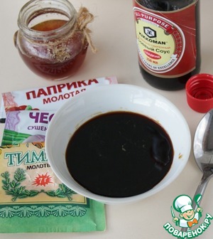 В чашке смешать соевый соус Kikkoman и мёд, можно сразу же добавить в маринад специи: сушеный чеснок, сладкую паприку, тимьян, всё размешать (или же можно приправить голени специями после маринада).