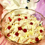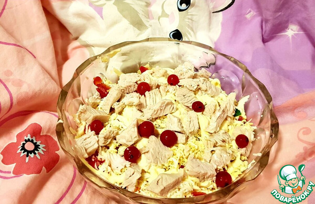 Пятый слой - выкладываем курочку, посыпаем сверху тертыми яйцами.
