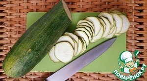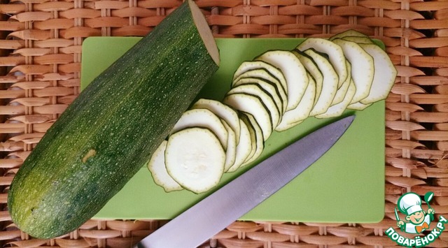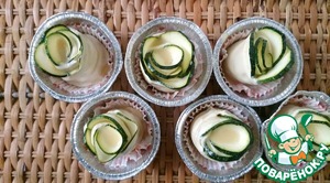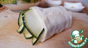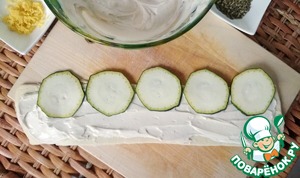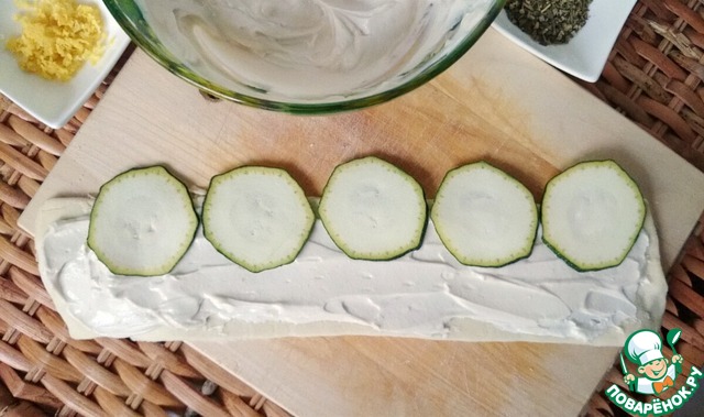Кладем по паре чайных ложек сырно-творожной начинки на каждую полоску теста, равномерно распределяем, затем выкладываем ломтики цуккини.