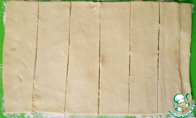 Тесто разрезаем на 6 частей, затем каждую полоску раскатываем, чтобы толщина оказалась равна 1-2 мм.