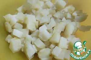 Картофель отвариваем в мундире, очищаем и нарезаем мелкими кубиками.