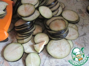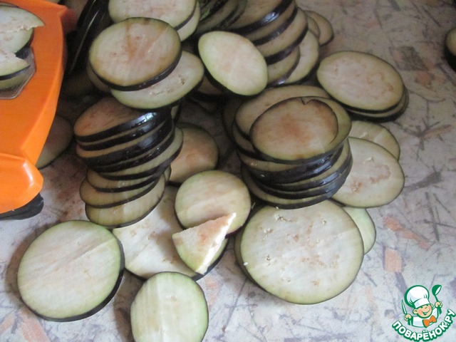 Баклажаны помыть и порезать на кружочки, как можно тоньше. Лучше воспользоваться теркой с V-образной вставкой. -