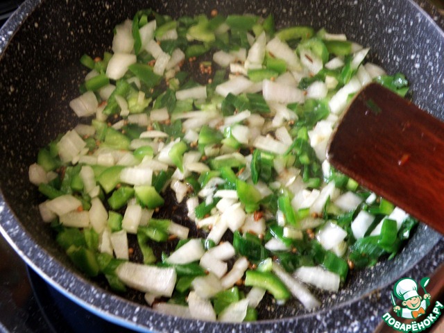 • Выложить лук – репчатый и зеленый, сладкий перец. Помешивая, немного потомить на среднем огне до прозрачности лука.