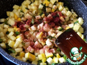 • Добавить цуккини. Тушить три минуты. Посыпать сумахом и имбирем, добавить мед и лимонный сок, тушить еще пару минут, помешивая.