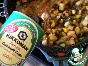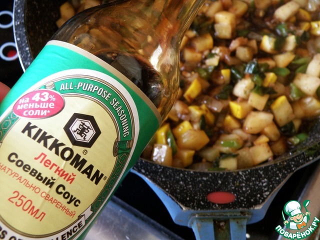• Полить овощи легким соевым соусом от «Киккоман» и тушить еще три минуты.