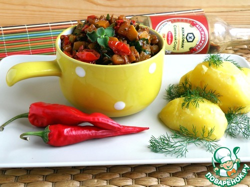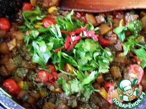 • Добавить мелко нарубленный чили и шинкованную зелень - кинзу и петрушку. Перемешать и выключить. Дать остыть и настояться.