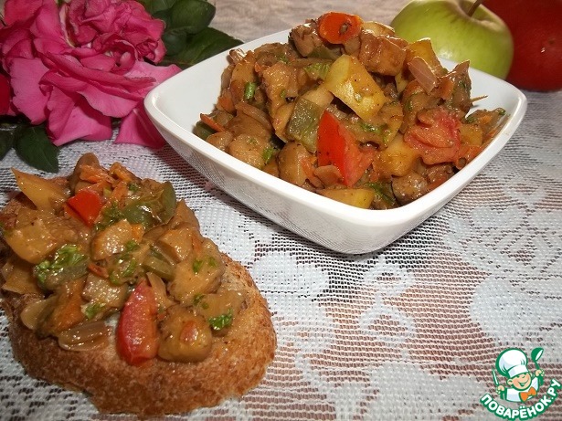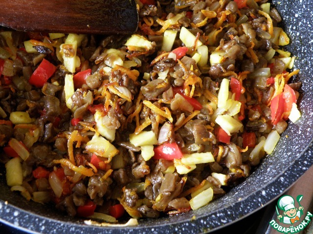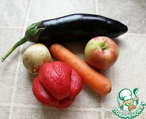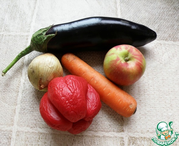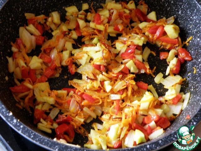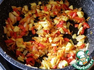Лук и перец нарезать кубиками, морковь натереть на мелкой терке. Яблоко очистить и тоже нарезать кубиками. Обжарить все на масле до легкой позолоты.