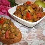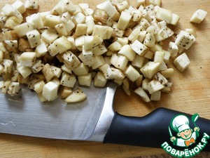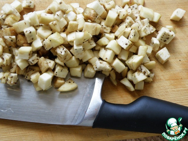 Баклажан использовать очищенный. Нарезать его мелкими кубиками.