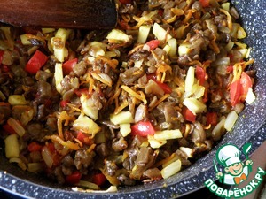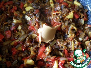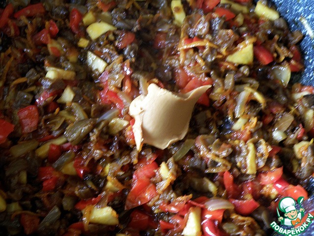Добавить баклажаны и жарить, помешивая, до полуготовности баклажанов.