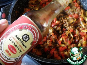 Полить овощи соевым соусом – вкусно использовать сладкий ТМ «Киккоман» - и тушить пару минут.