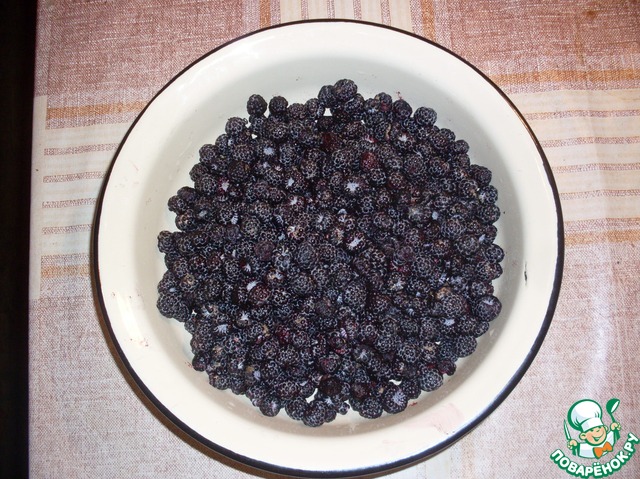 Отмерить половину количества сахарного песка. Послойно пересыпать ягоду песком в эмалированной или любой другой, кроме алюминиевой, посуде и поставить в прохладное место, можно на всю ночь. Ягода ежемалины не такая нежная, как малина и ежевика, и сока дает немного. Поэтому и варим сироп.