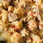 Разделить цветную капусту на соцветия и отварить в подсоленной воде 10 минут. Куриную грудку порезать мелкими кусочками и обжарить на сковороде.