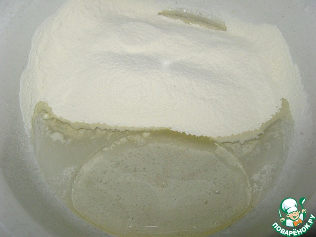 В тёплой воде растворить соль. Влить 2 ст. л. растительного масла, частями ввести просеянную муку, примерно 300 гр.