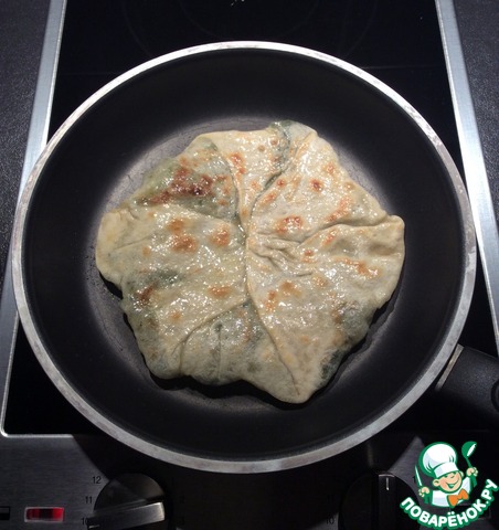 Накрыть второй половиной. Подпыляя мукой, скрепить пальцами края лепёшки.