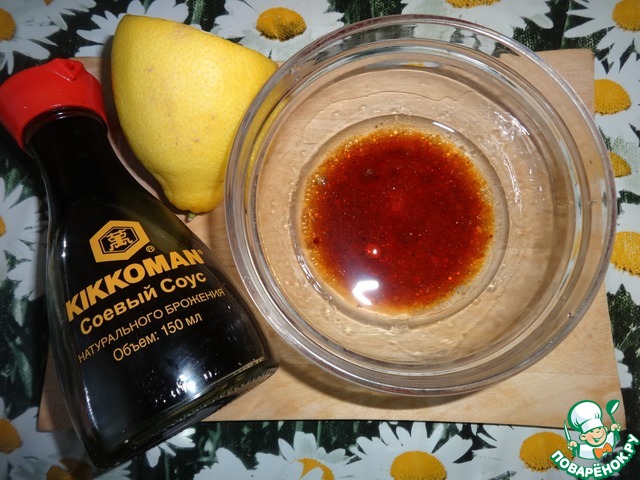 • Для заправки влить в небольшую емкость соевый соус, лимонный сок, оливковое масло, мёд. Всё хорошо перемешать, до полного объединения ингредиентов, добавить перец черный. Заправка готова.