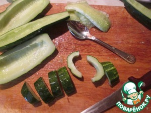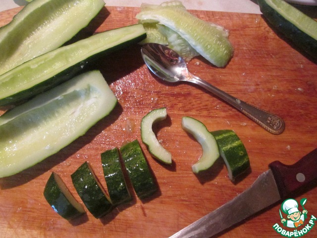 Огурцы разрезать пополам ( вдоль ) и выскрести чайной ложкой семена. Порезать кусочками примерно 1,5 см.