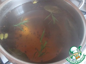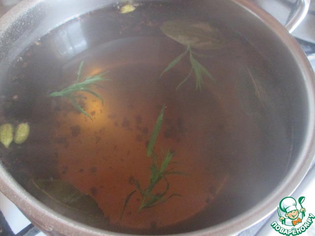Кардамон и два вида перца слегка растолочь в ступке. Довести до кипения воду вместе с пряностями, солью и медом. Добавить несколько листочков тархуна.