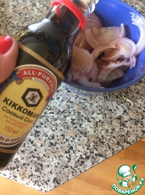 Лук нашинковать полукольцами, замариновать в смеси соуса Киккоман натурального брожения, мёда, 1 ч. л. винного уксуса.