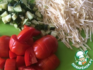 Сельдерей порезать очень тонкой соломкой, огурец - кубиком, помидор- крупным кубиком.