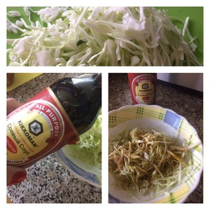 Капусту нашинковать, чуть пожамкать её и замариновать в соевом соусе сладком Киккоман с добавлением 1ч. л. винного уксуса. -