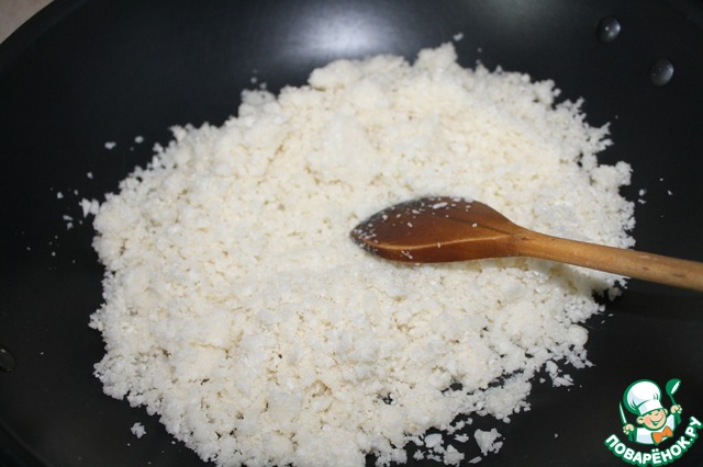 Разогреть объемную сковороду и обжарить капусту постоянно помешивая около 5 минут