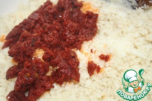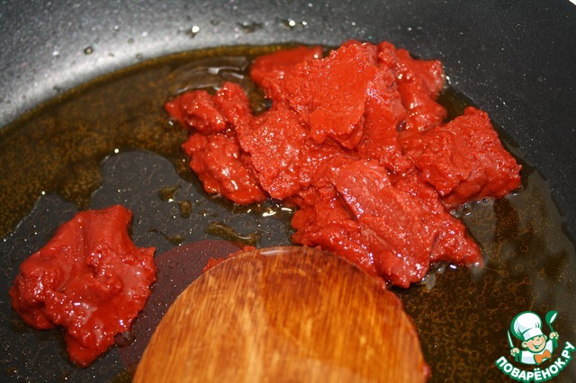 На другой сковороде раскаливаем масло и обжариваем томат пасту с добавление сахара и острого перца.